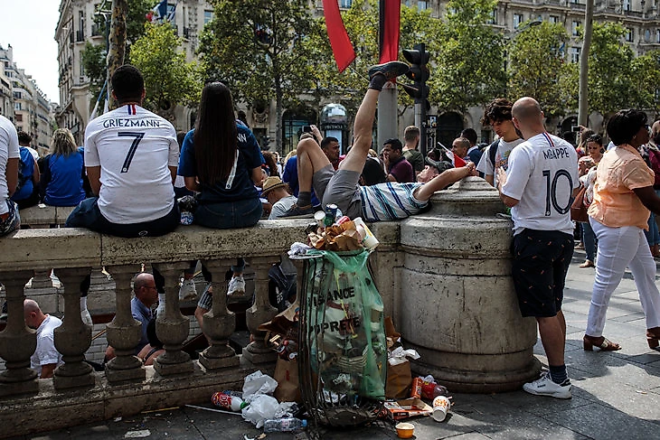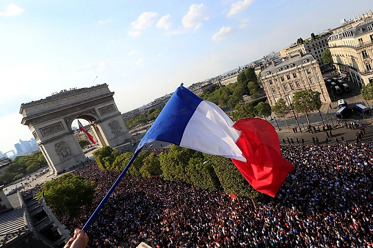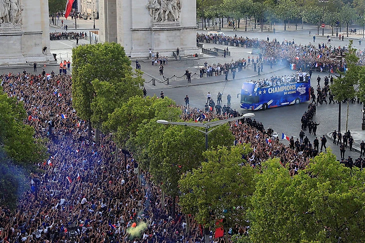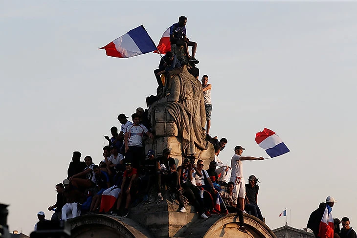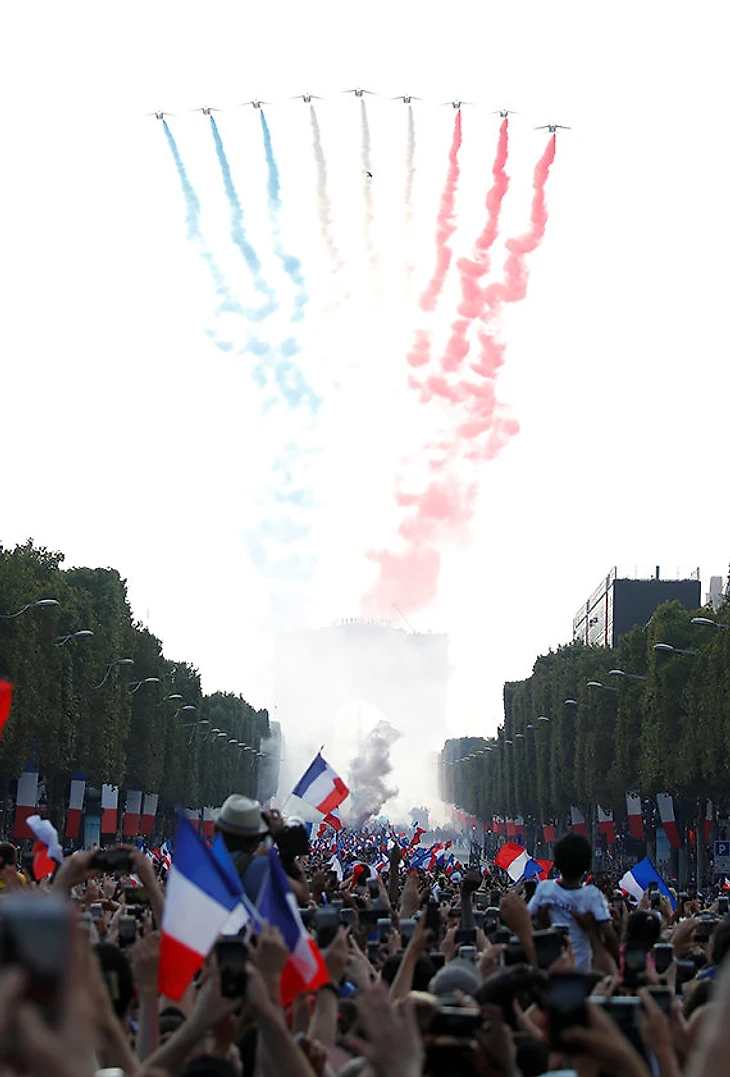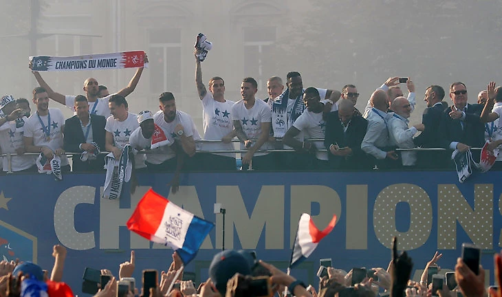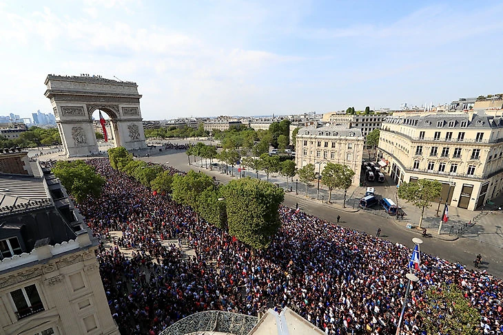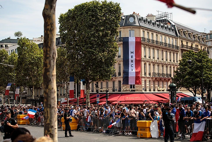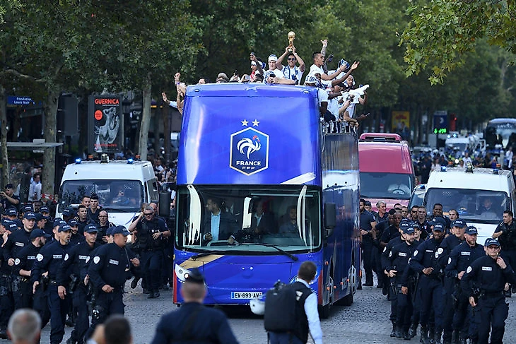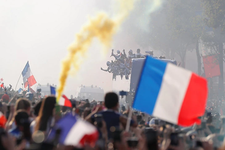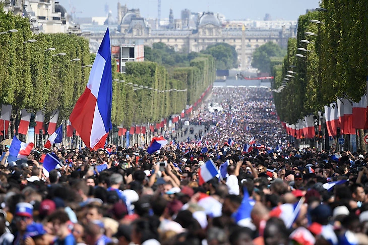В понедельник с самого утра фанаты сборной Франции вышли на чемпионский парад. Многие из них никуда не уходили после вчерашнего финала, в котором французы обыграли хорватов – 4:2. ESPN писал, что ночью на Елисейских полях победу праздновали 300 тысяч человек.