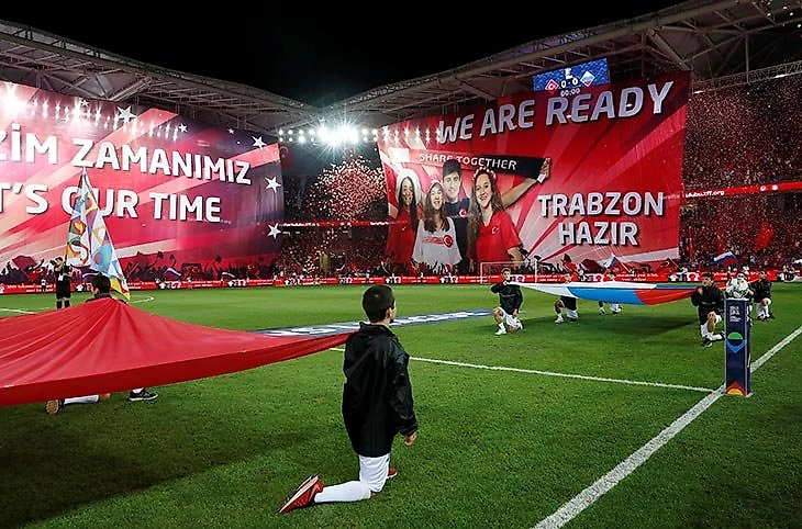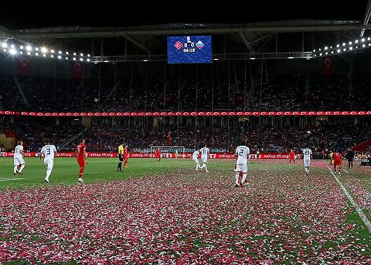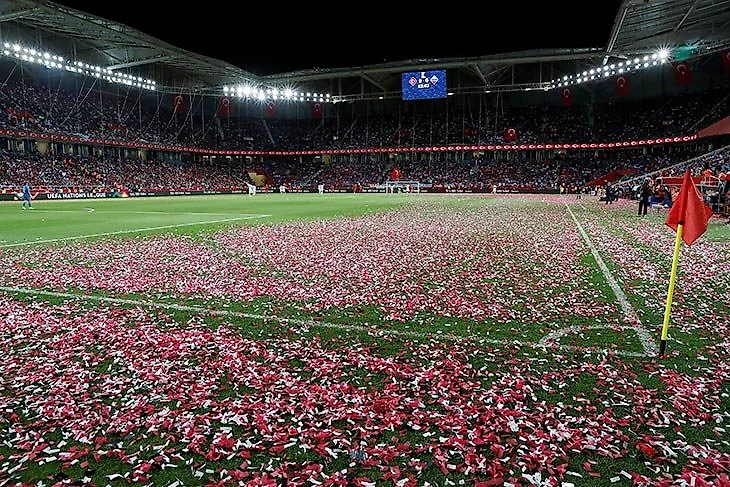 Огромные баннеры с надписями о том, что Турция готова, что это ее время, что все объединились (все – под заявку страны на Евро-2024), дополнялись залпом из красных и белых бумажек, которые красиво переливались в воздухе.