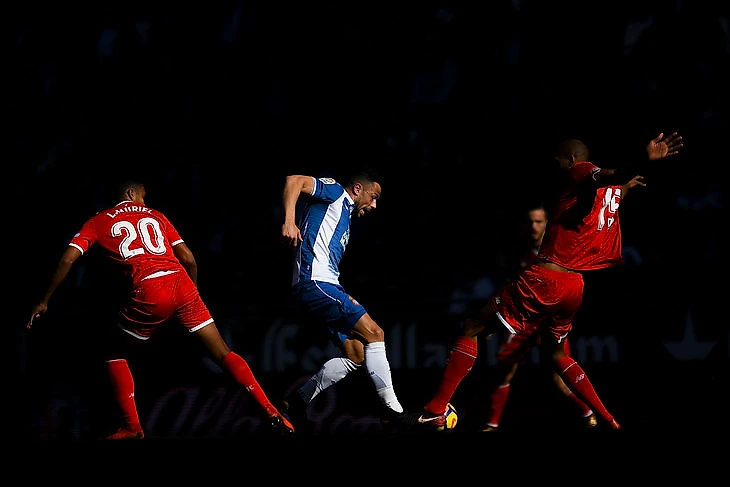 20 января, Барселона. Игра «Эспаньола» (Хави Фуего в центре), «Севильи» (Луис Муриэль и Стивен Нзонзи по бокам), света и тени.
