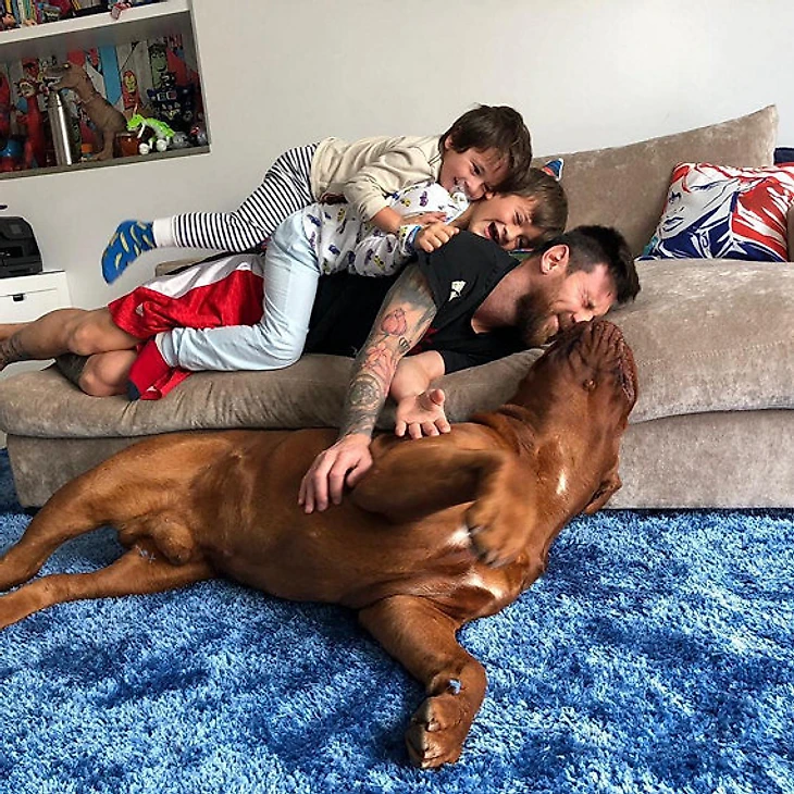 А это Месси и его сыновья с псом Халком. Жена подарила ему собаку на день рождения в 2016 году. Это бордоский дог – собаки этой породы вырастают до 67 см в длину. Взрослые самцы обычно весят 55-65 кг, но могут достигать и 90 кг.