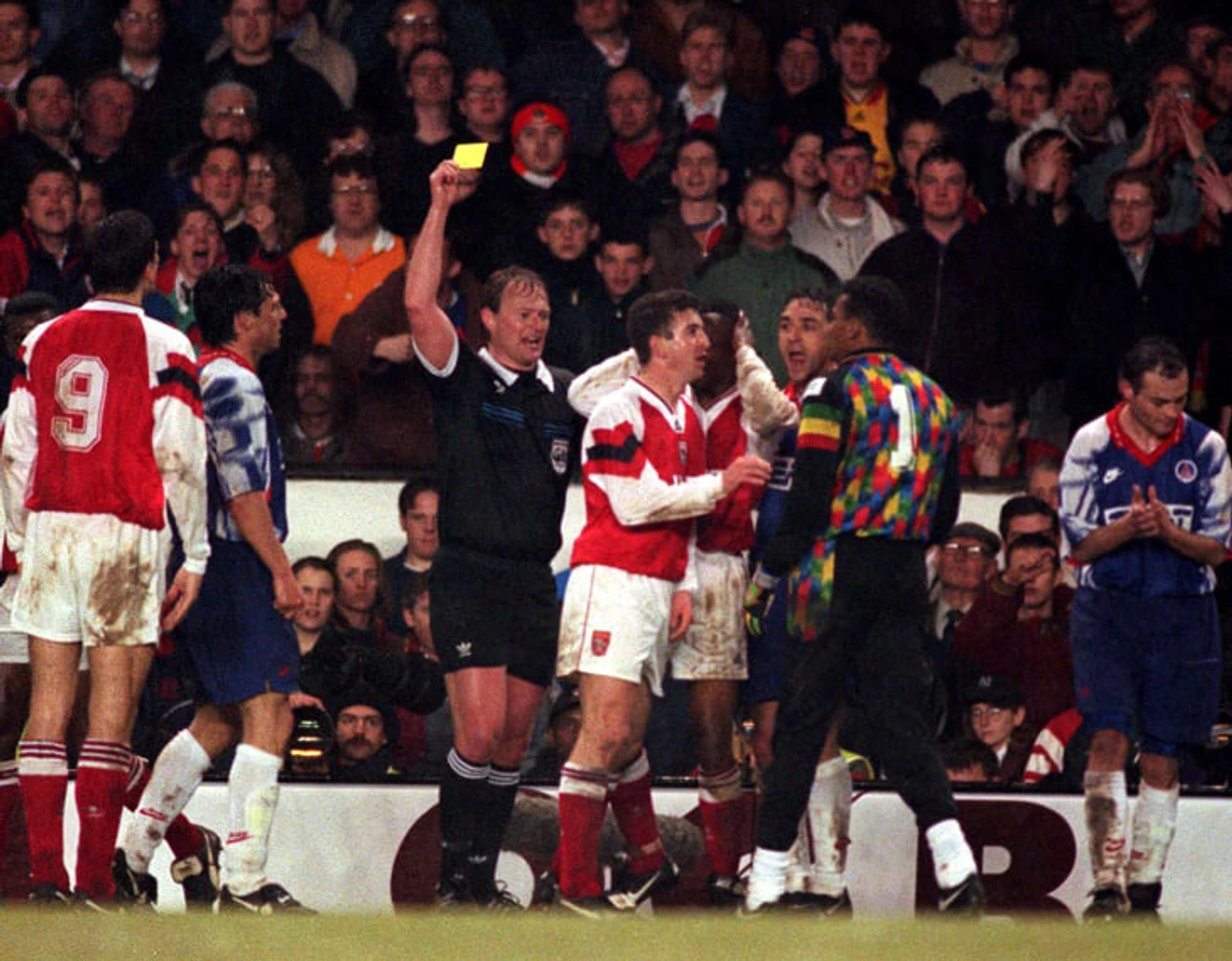 Иан Райт получает желтую карточку в матче с ПСЖ