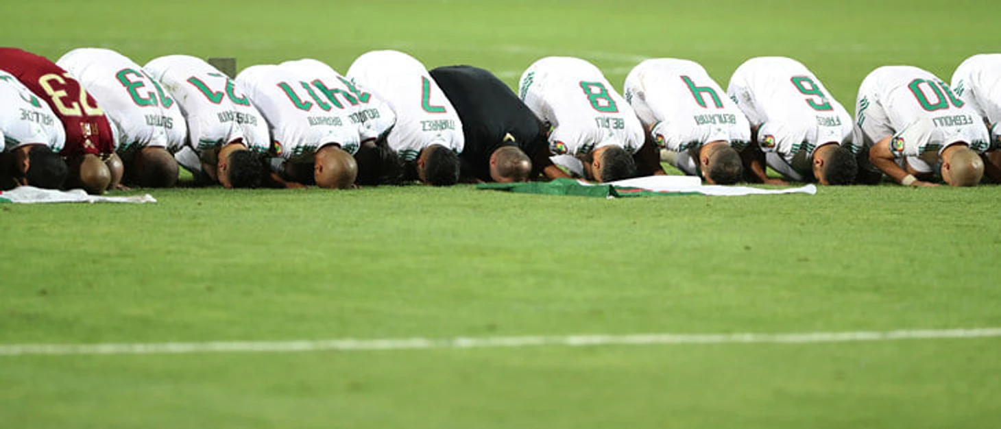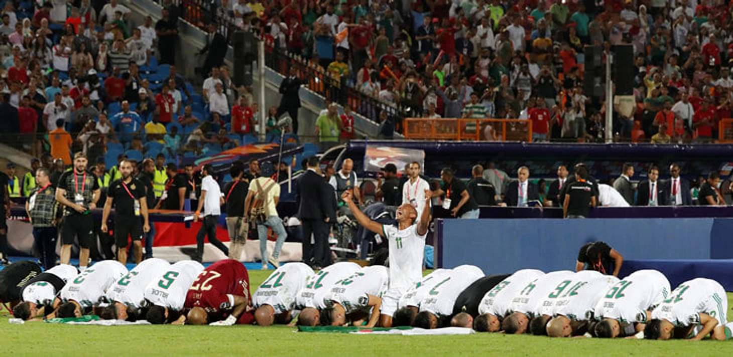 После победы вся сборная Алжира молилась перед фанатской трибуной.