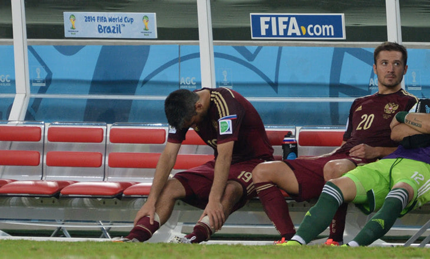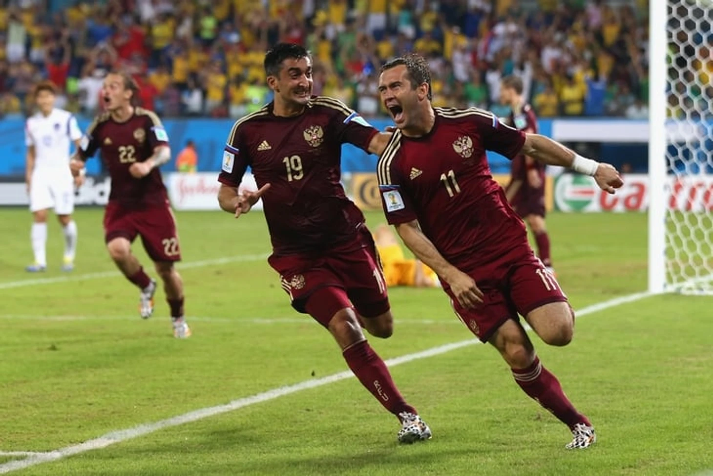 11. ЧМ-2014. Самедов с Кержаковым празднуют гол Корее и еще не знают, как грустно для нас закончится турнир.