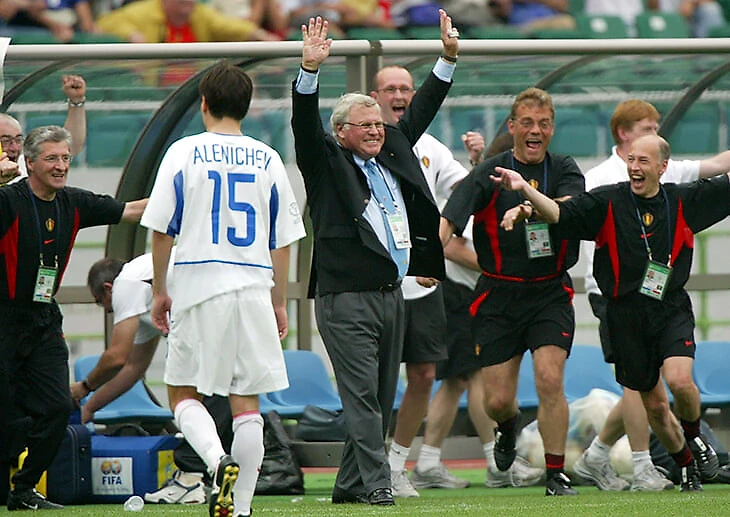 Справа от Аленичева – 62-летний главный тренер Бельгии Робер Васеж. После успеха на ЧМ-2002 (Бельгия вылетела в 1/8-й, доставив максимум проблем бразильцам), он пришел в «Стандард». Дальше он работал в том числе со сборной Алжира. В июле этого года Васеж умер, у него были проблемы с сердцем.