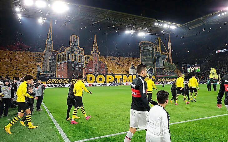 Второй этап: выразить уважение «Дортмунду»-клубу. По сигналу фаны перевернули листы – на другой стороне появились черный и желтый цвета «Боруссии», а место орла заняла эмблема клуба.