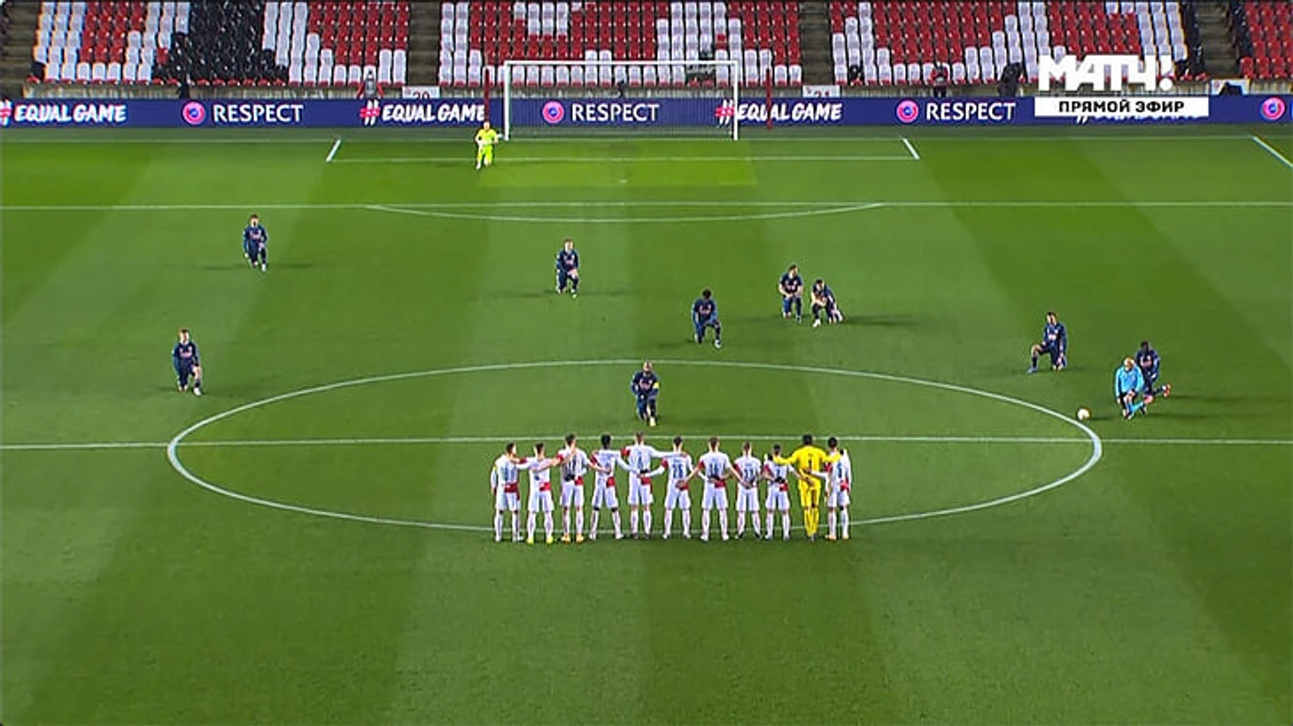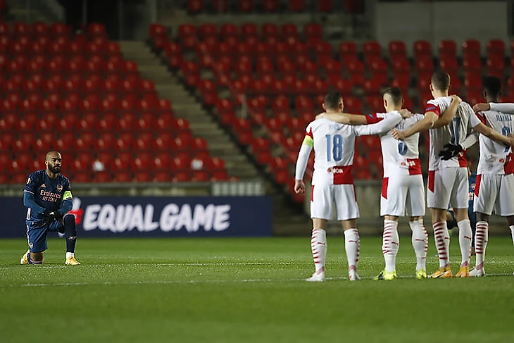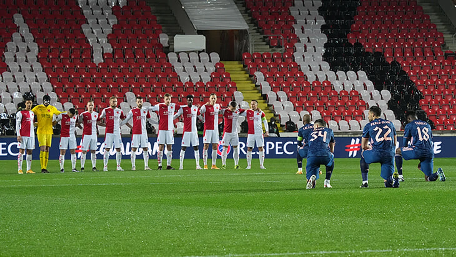 Контраст перед свистком в Праге: игроки «Славии» выстроились в ряд перед вставшим на колено «Арсеналом»