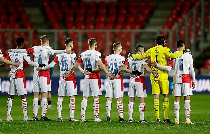 Игроки «Славии», в отличие от матча в Лондоне, когда они просто не встали на колено, а остались на своих позициях, выстроились в линию – явно намекая на поддержку партнера.