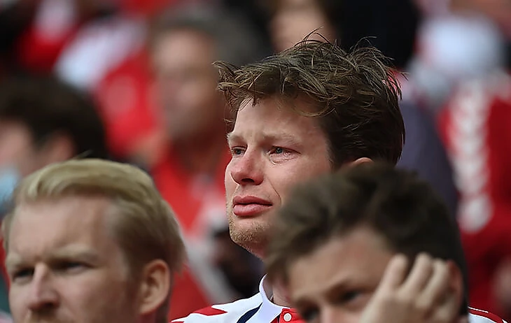 Страшный момент. Игроки сборной Дании закрывают собой Эриксена и не скрывают слез