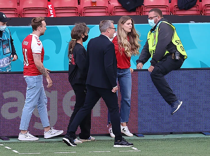 К полю спустилась девушка Эриксена – Сабрина Квист Йенсен. Они вместе с 2012 года, в 2018 году у них родился сын Альфред.