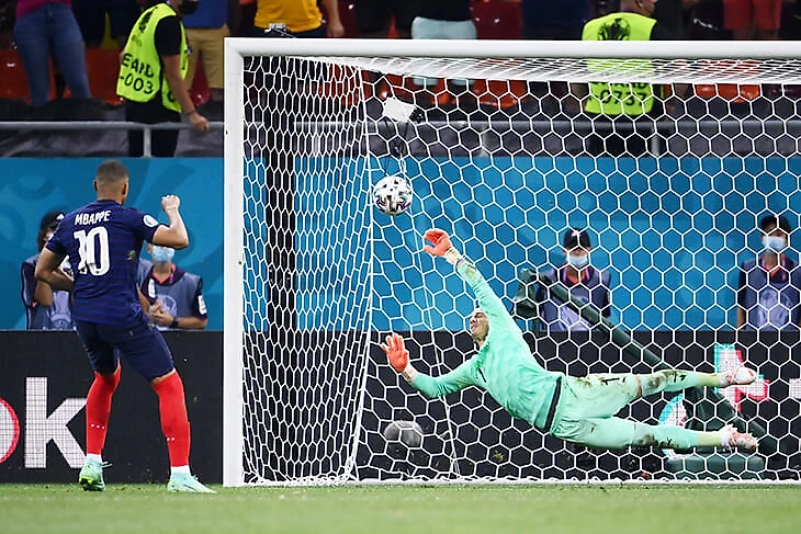 В серии все шло идеально до десятого удара. Вторыми били французы, последний обязательный доверили Килиану Мбаппе. Он пробил в левый от себя угол.