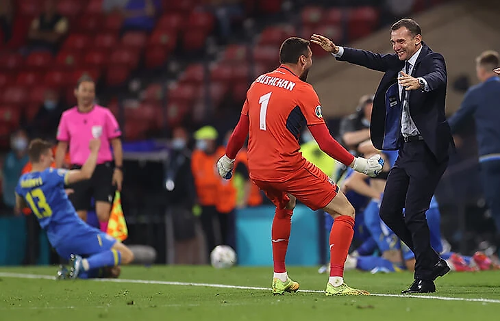 А вратарь Георгий Бущан побежал не ко всем, а отдельно к Андрею Шевченко.