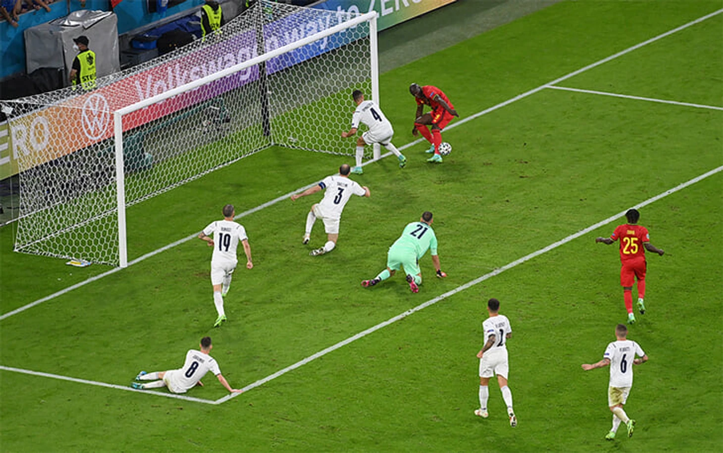 Один из самых ярких моментов матча Италии с Бельгией – сэйв Спинаццолы: он очень к месту поставил область пониже спины на путь мяча. В какой-то момент бельгийцы прижали соперника, а Лукаку после прострела чуть не занес мяч в ворота.