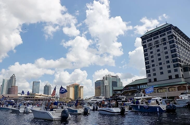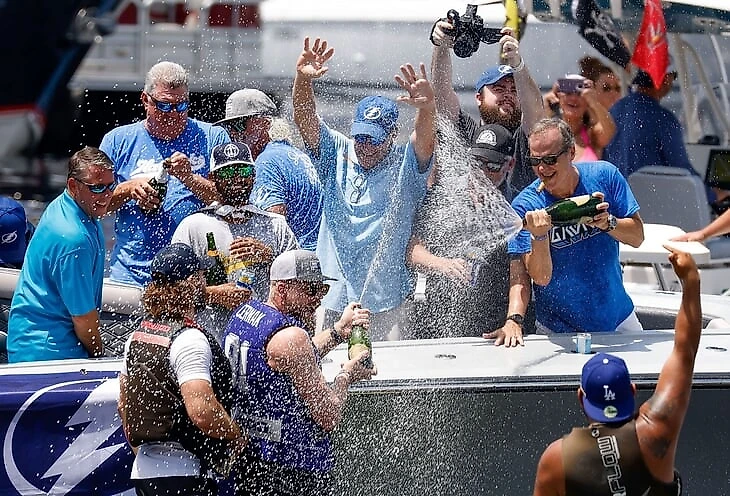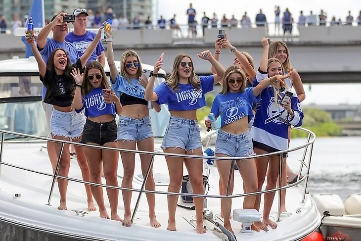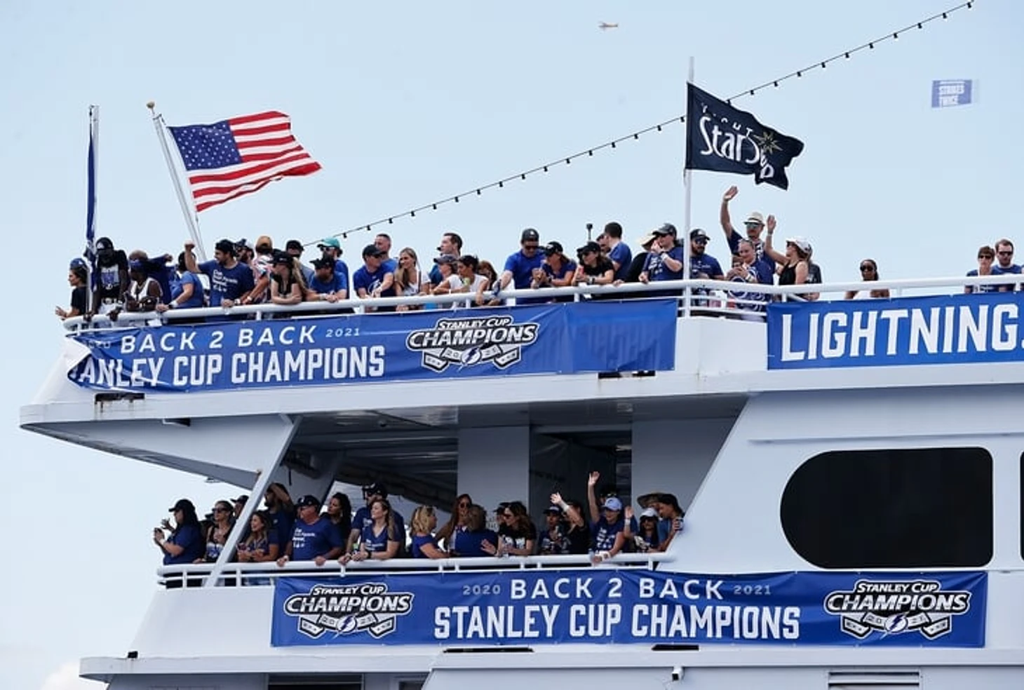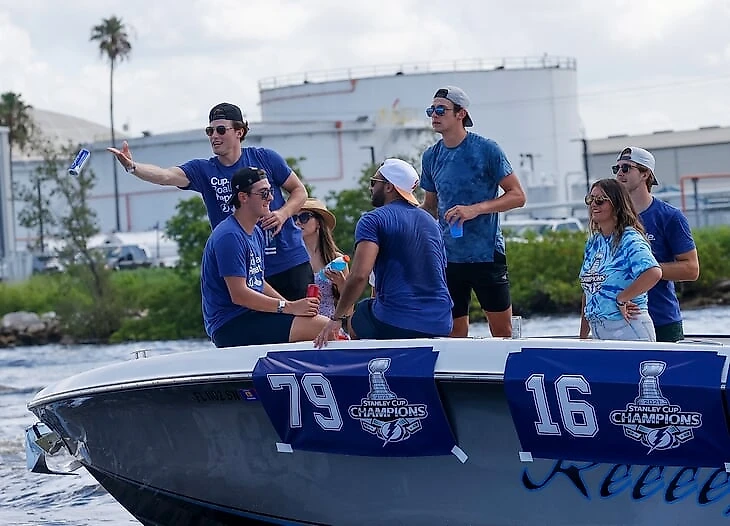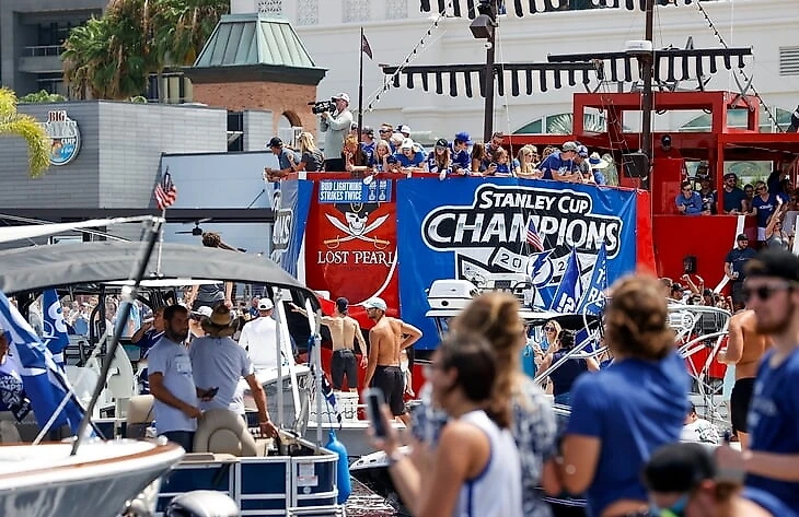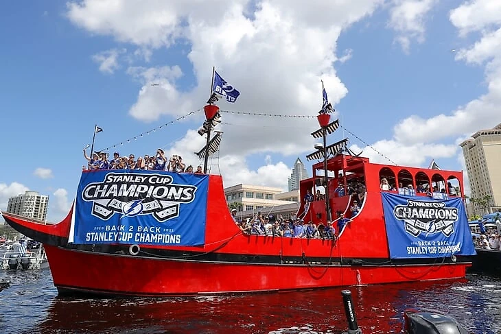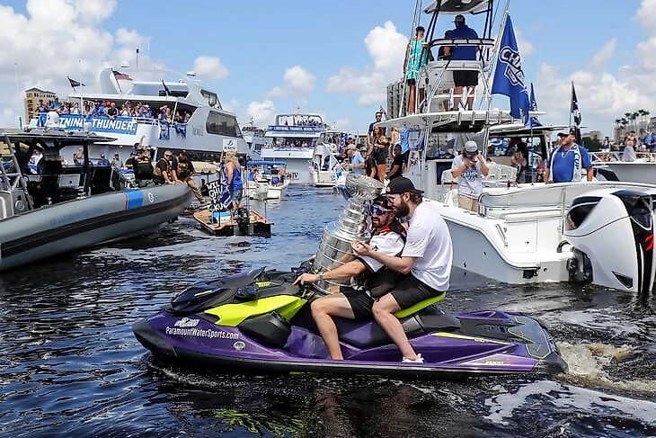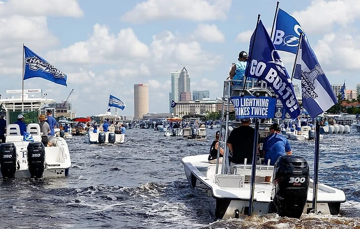 Речные чемпионские парады на реке Хилсборо начинают входить в традицию Тампы. В прошлом октябре тренд задали хоккеисты «Лайтнинг», ярко отметив победу в коронавирусном плей-офф, в феврале пример взяли «Бакканирс», выигравшие Супербоул, и спустя 10 месяцев «Молния» вернулась на то же место, с тем же трофеем в руках.
