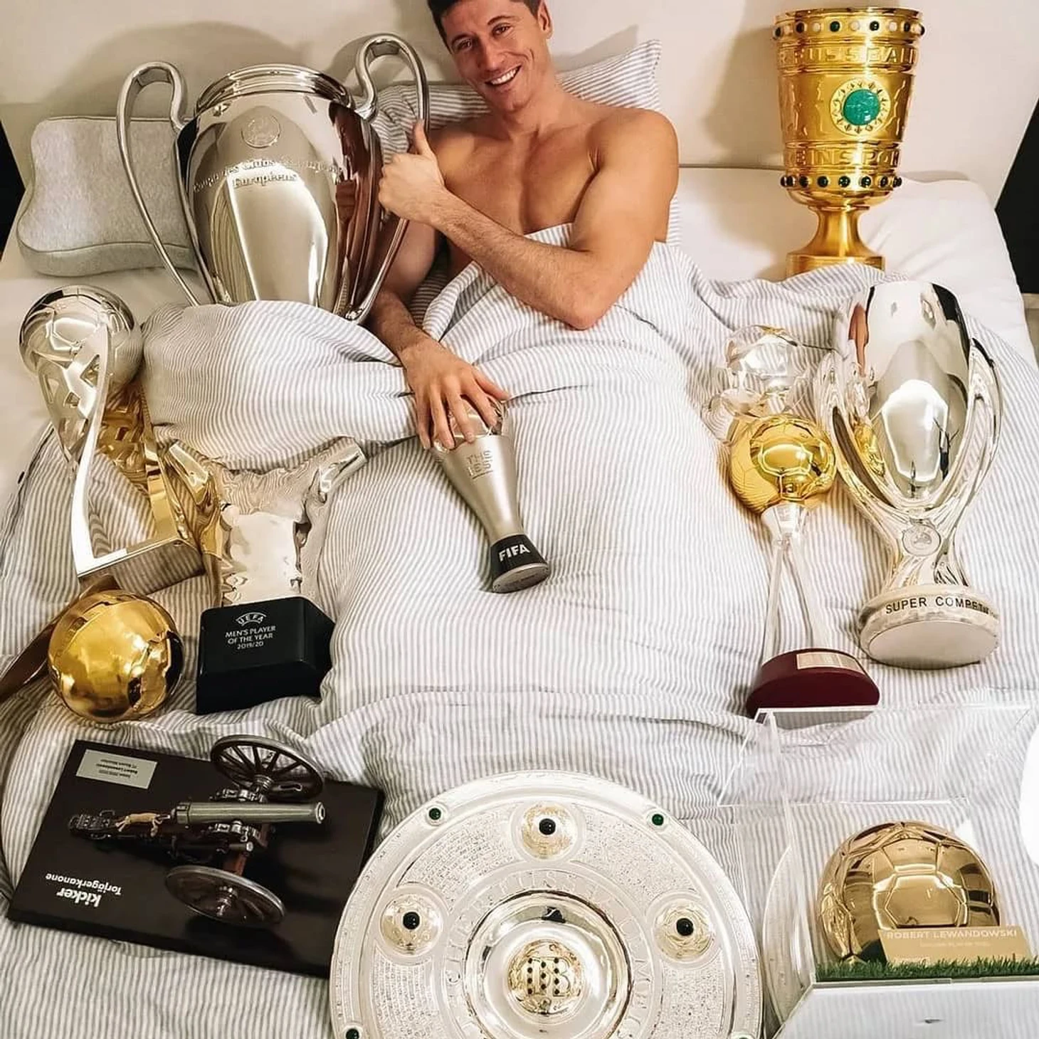 🛏 Левандовски обожает фото с трофеями в постели: «Золотая бутса», кубок ЛЧ и все награды «Баварии» за 2020-й