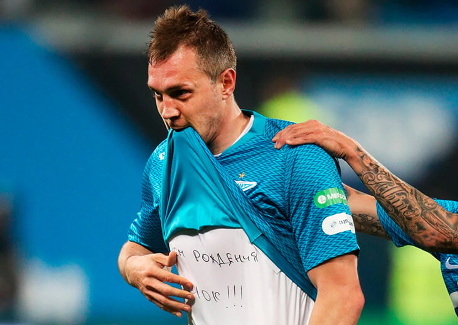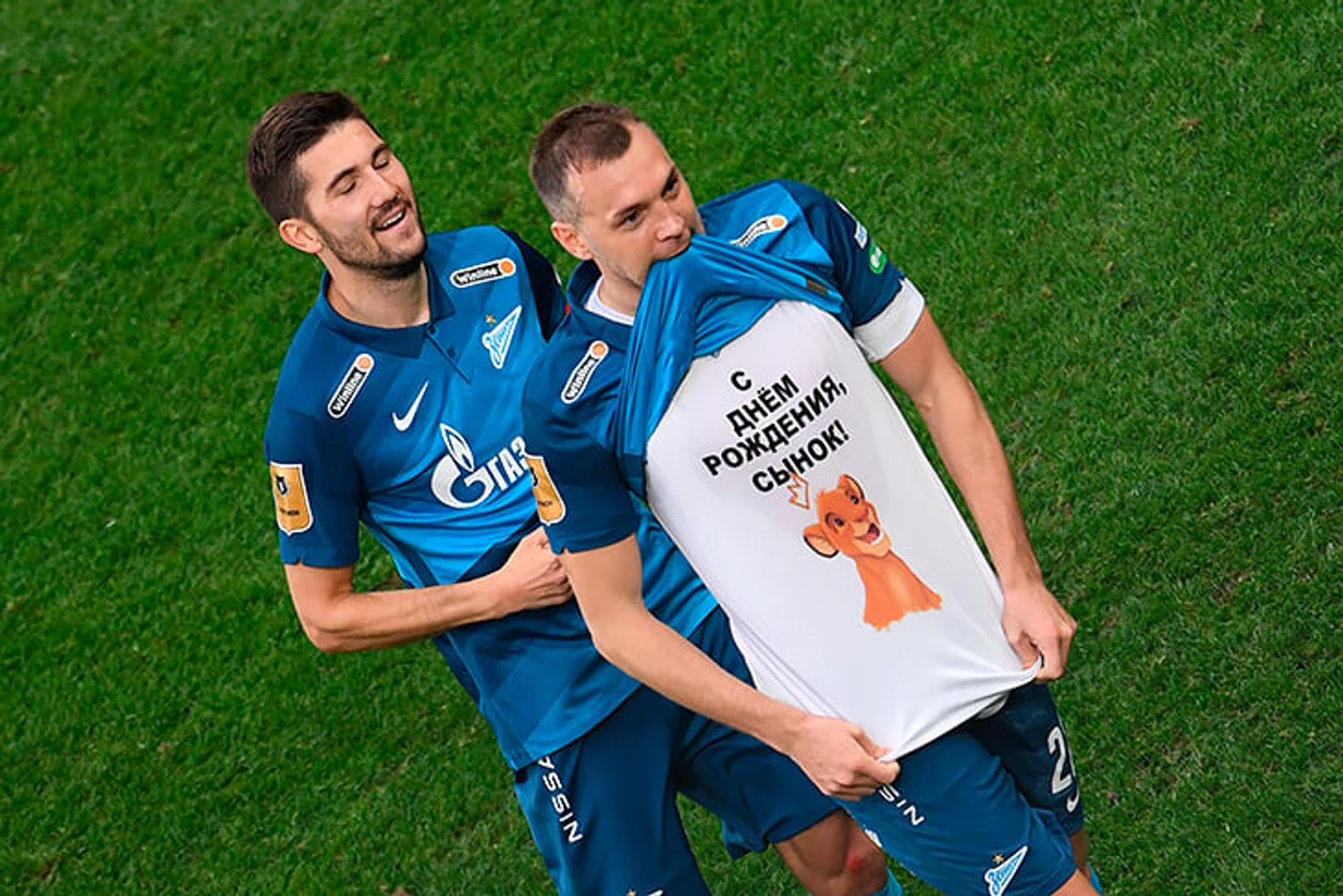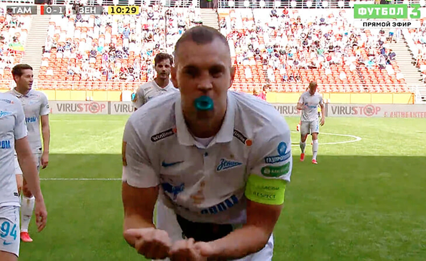 В майском матче против «Тамбова» Дзюба подготовил сразу несколько празднований: сначала взял соску в рот, отметив рождение третьего сына.