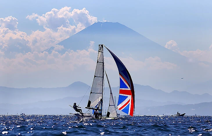 21 июля. Спортсмены из парусных видов тренируются на фоне Фудзиямы.