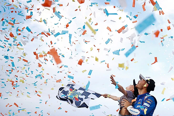 7 ноября. Гонщик NASCAR Кайл Ларсон, его сын, ясное небо и разноцветный салют.
