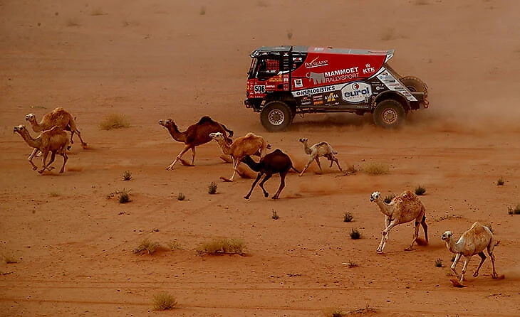 13 января. Аравийские верблюды пытаются обогнать грузовик на Дакаре.