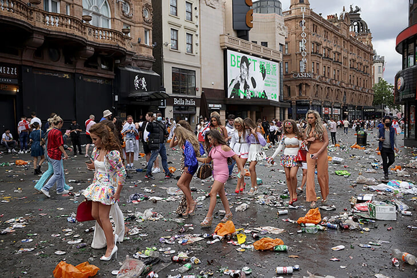 11 июля. Инородно выглядящие дамы идут по стеклу, пластику и прочему мусору, который оставили после себя английские фанаты на Лестер-сквер в Лондоне.