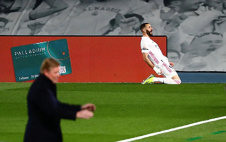 10 апреля. У Карима Бензема и Роналда Кумана очень разное настроение. Француз только что забил шикарный гол в класико.