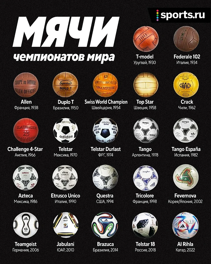 Все мячи на чемпионатах мира: в финале-1930 сыграли двумя разными, классику-1970 назвали в честь спутника, «джабулани»... Ох, «джабулани»!