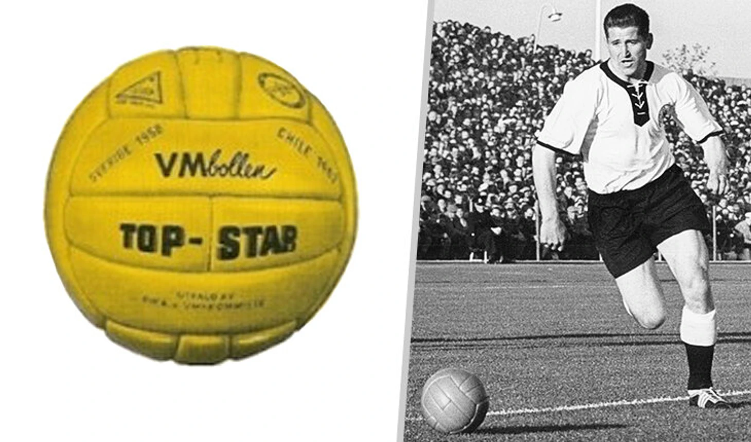 1958, Top Star, Швеция. Производитель из шведского города Энгельхольм выиграл первый в истории чемпионатов мира слепой конкурс. ФИФА попросила 102 претендентов прислать свои мячи без маркировки. Каждому присвоили кодовый номер. Организаторы тестировали мячи и отобрали 10 лучших – в итоге победил мяч №55.