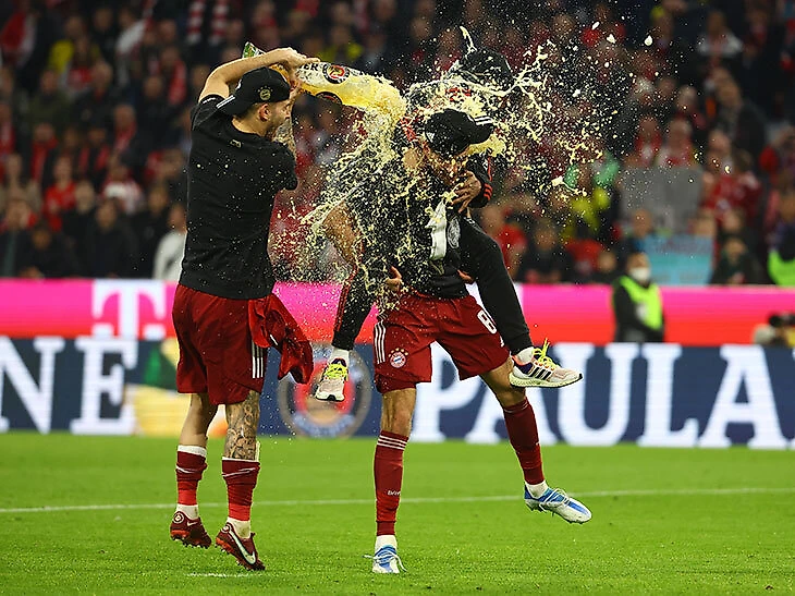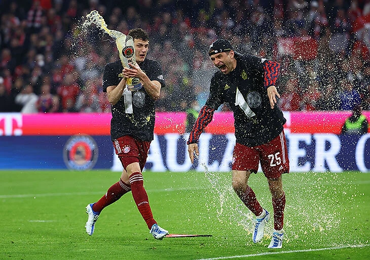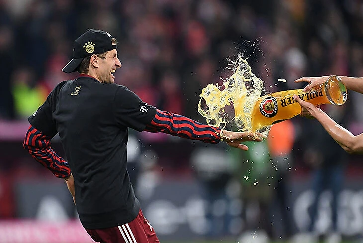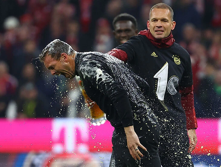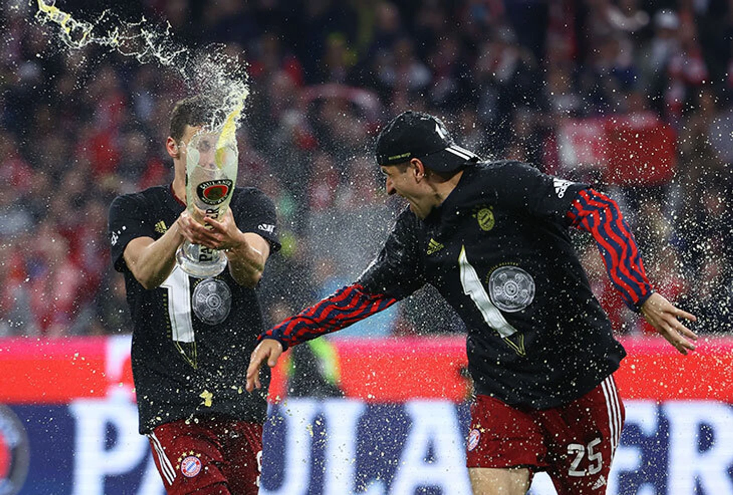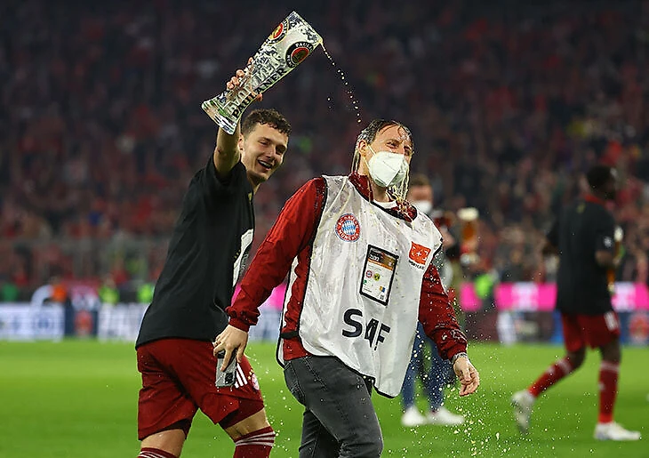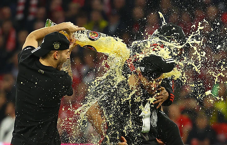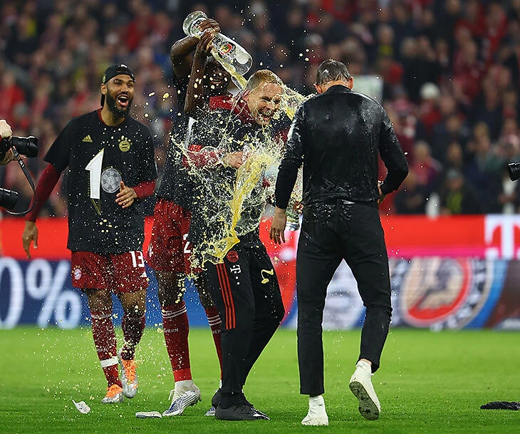 Уверенная победа над «Дортмундом» (3:1) подарила «Баварии» 10-й титул Бундеслиги подряд – и лучший повод для традиционного пивного душа.