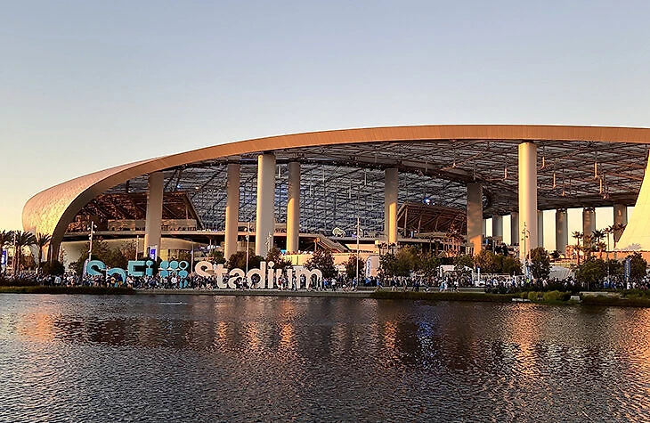 Стадион в Лос-Анджелесе тоже изначально строили для двух команд НФЛ – «Лос-Анджелес Рэмс» и «Лос-Анджелес Чарджес». Его открыли в 2020-м, вложили $5-6 млрд. В феврале 2022-го арена, вмещающая более 70 тысяч, приняла Супербоул.