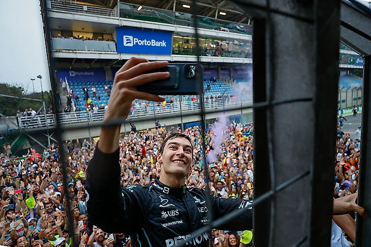 13 ноября. «Формула-1» в Бразилии. Джордж Расселл из «Мерседеса» делает фото на память после дебютной победы в карьере.