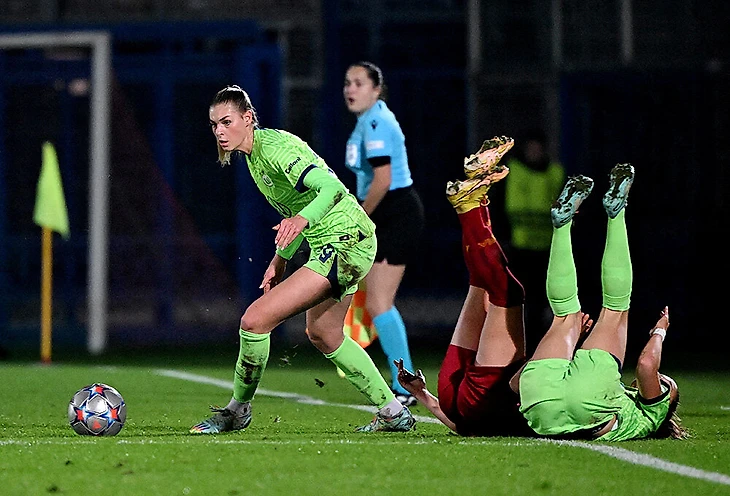 23 ноября. «Вольфсбург» – «Рома». Женская Лига чемпионов. На переднем плане – Джул Бранд. Кто на заднем плане, и что там вообще случилось, сказать сложнее.