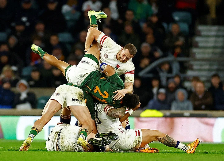 26 ноября. Джонни Хилл из сборной Англии по регби утрамбовывает кого-то из южноафриканцев. Но это лишь эпизод, в итоге англичане проиграли.