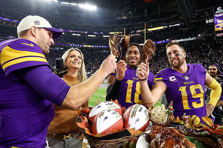 24 ноября. Звезды «Миннесоты» Кирк Казинс, Джастин Джефферсон и Адам Тилен за индейкой отмечают День благодарения и победу над «Пэтриотс».