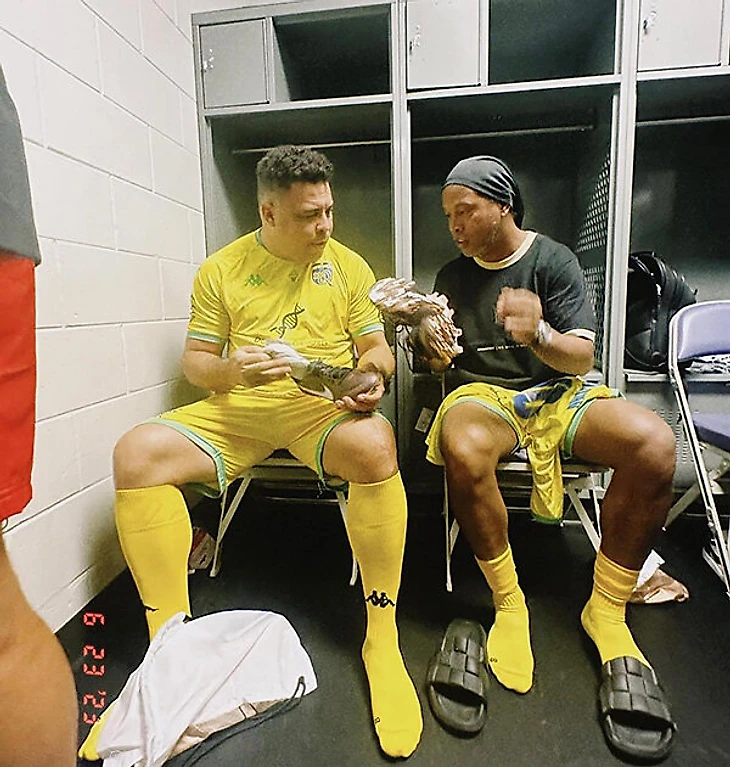 Вы только гляньте на эту дрим-тим: Винисиус, Ривалдо, Роналдиньо и Роналдо. В центре 18-летний Жоау Мендес, сын Роналдиньо, который недавно подписал контракт с «Барселоной» и будет играть за молодежку каталонцев.