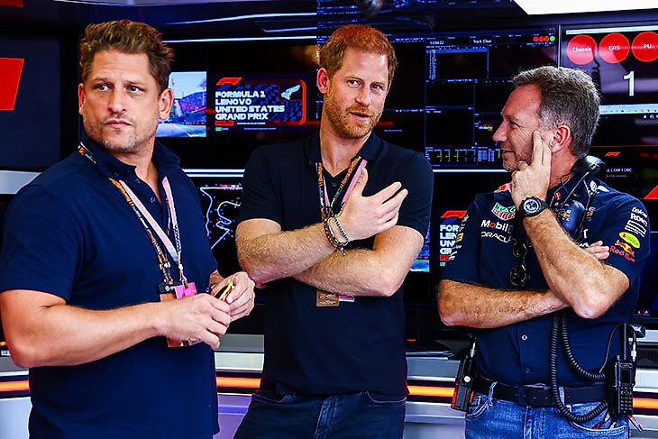 Но да, вам не показалось: на шее у принца – дейсвительно вип-пропуск гостя «Ред Булл». И член британского королевского дома отправился в боксы к чемпионам на гонку: