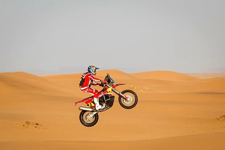 Классический трюк байкера для ускорения в дюнах – чтобы не тратить топливо на повторный разгон! В кадре Даниэль Сандерс.