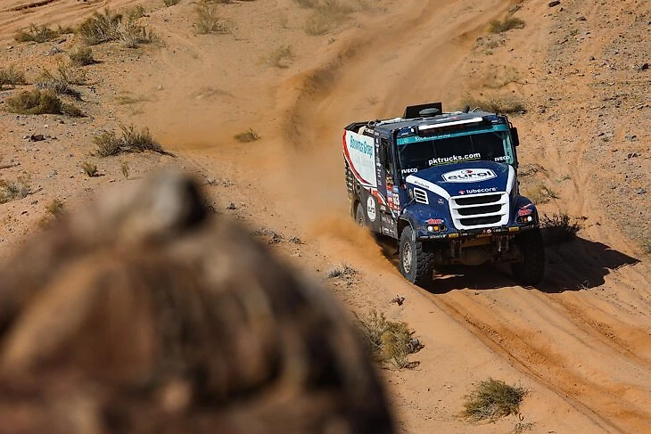 А это уже быстрый и каменистый 11-й этап – один из самых сложных для колес и техники из-за абсолютной остроты и безжалостности покрытия. Его штурмует Герт Хузник на экспериментальной гибридной «Рено».