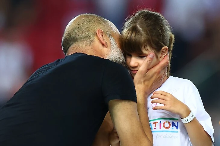Так Гвардиола приветствует Лукию, бенефициара Фонда УЕФА, на трибуне после победы над «Севильей» в матче за Суперкубок УЕФА-2023.