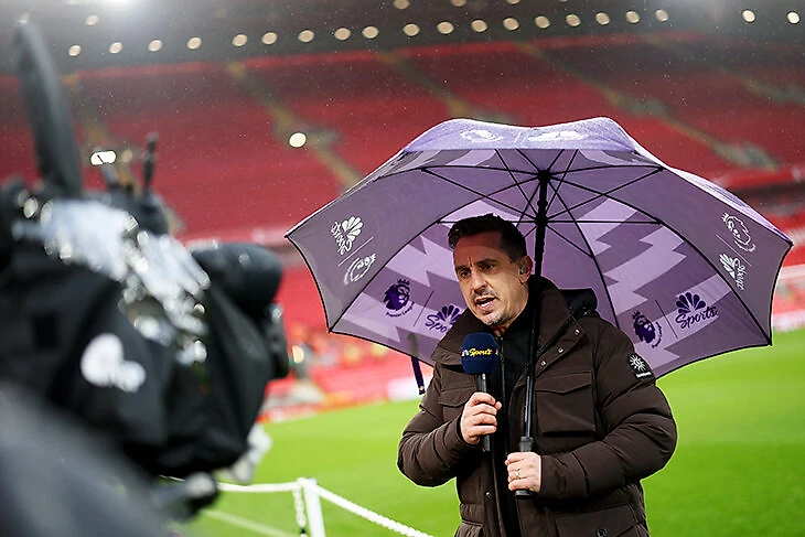 Днем начался дождь, поэтому Гари Невилл выходил в эфир под фирменным зонтиком.
