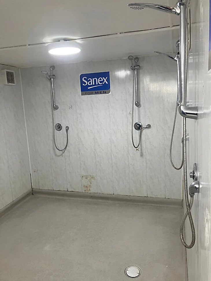 В раздевалке сломанная дверь, обогреватель и шесть душевых (работает половина)