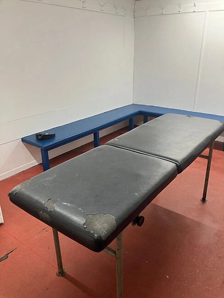 Внутри L-образная скамейка, старая тактическая доска и давно подуставший массажный стол.