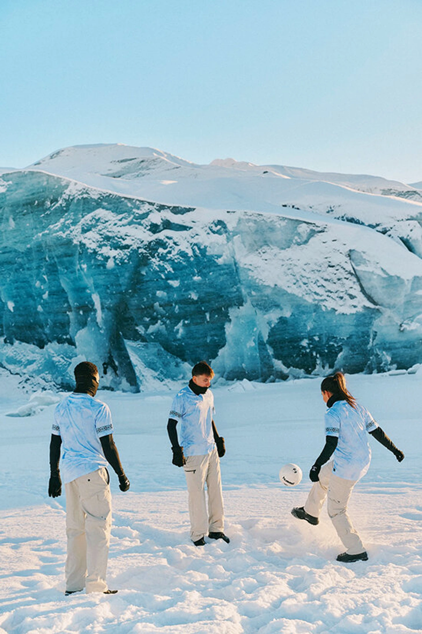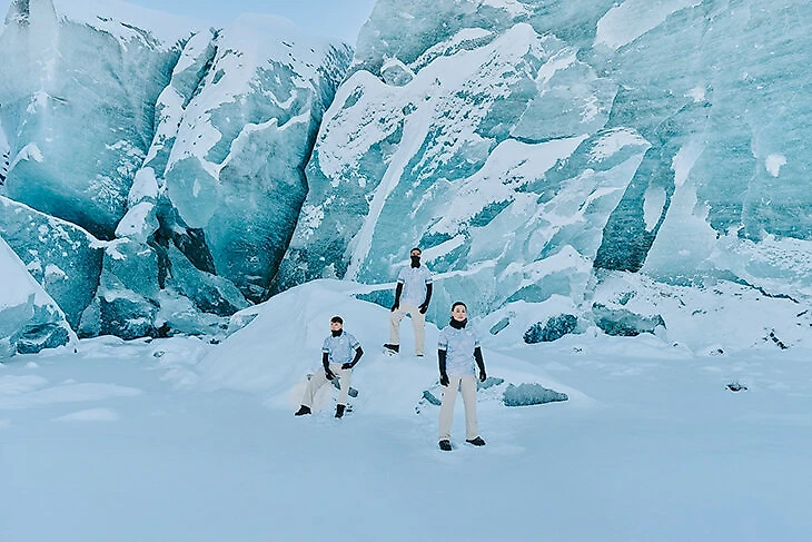 «Дизайн выездного комплекта черпает вдохновение из замысловатых природных узоров, сформированных льдами, – говорится в описании. – Его текстурированная графика прославляет тихую, но огромную силу ледников, в то время как тонкие детали на рукавах отсылают к искусству традиционной гренландской одежды, такой как камиккер (обувь инуитов) и вышитые национальные костюмы».