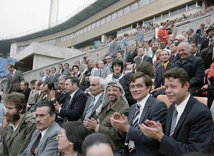 Ясир Арафат, в то время председатель исполкома Организации Освобождения Палестины, на трибуне: