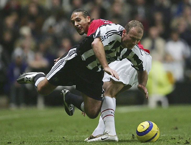Алан Ширер продолжает забивать за «Ньюкасл» и поднимать рекорд по голам в премьер-лиге. Рио Фердинанд пытается ему помешать.
