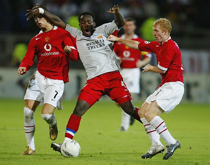 Криштиану Роналду, Пол Скоулз и Майкл Эссьен сходятся в матче Лиги чемпионов между «МЮ» и «Лионом».