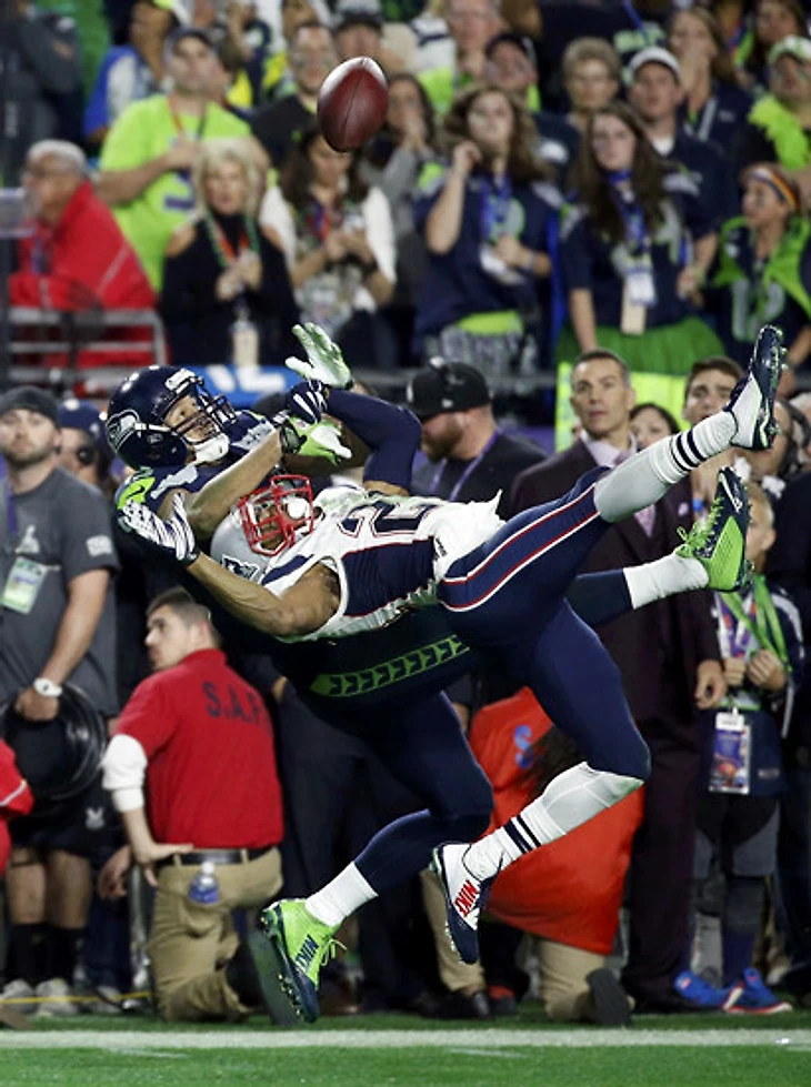 Ресивер «Сиэтла» Джермэйн Кирс (№15) в отчаянной борьбе с сэйфти «Пэтриотс» Малколмом Батлером (№21).