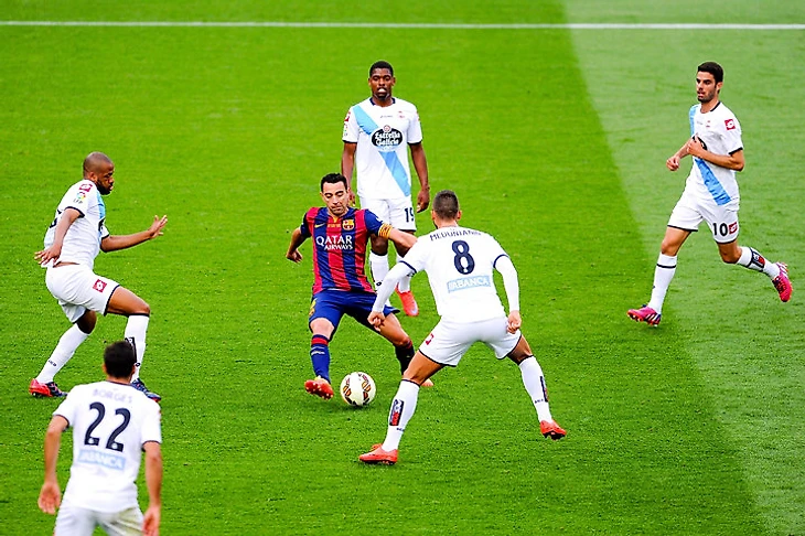 6-й номер «Барселоны» в окружении игроков «Депортиво».