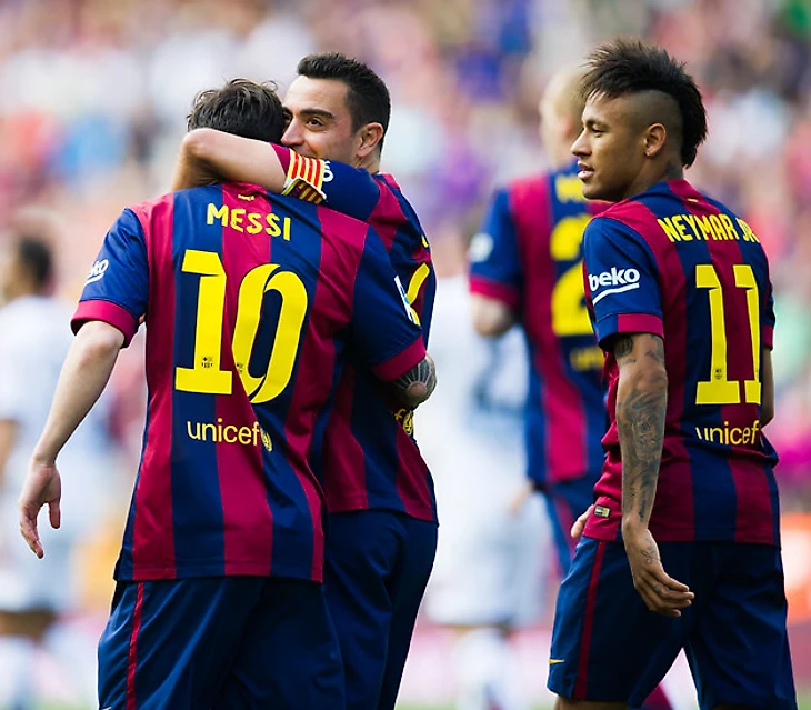 Хави поздравляет Лионеля Месси с первым голом в ворота «Депортиво».