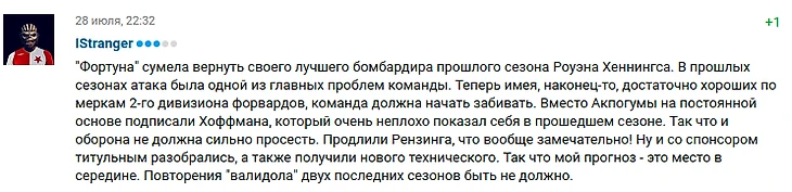 Ну и уверен, что болельщикам придётся тревожно. Уход лидера атаки Бебу, а также травма вратаря Ренсинга - это плохо. Допускаю, что у Фортуны в сентябре будет некоторый "отскок" по результатам.