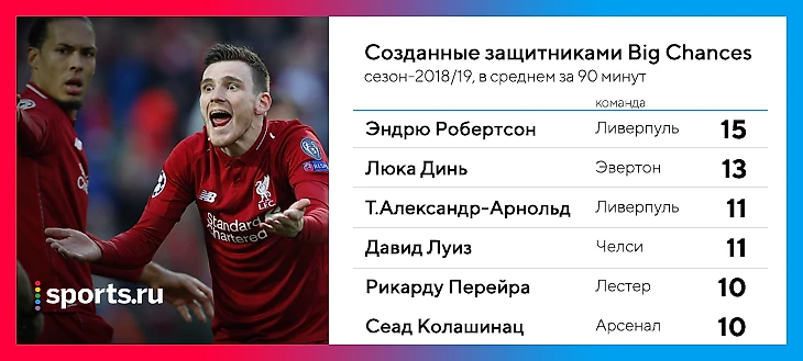 В двадцатке лучших по созданным Big Chances (явные голевые моменты, после которых партнер умудрился не забить) в АПЛ сразу пятеро – фулбеки. У лидера Фрейзера 28 созданных шансов, у Азара – 18, дальше более-менее ровно. А вот как выглядит топ среди защитников – несильно отстали от лидеров.