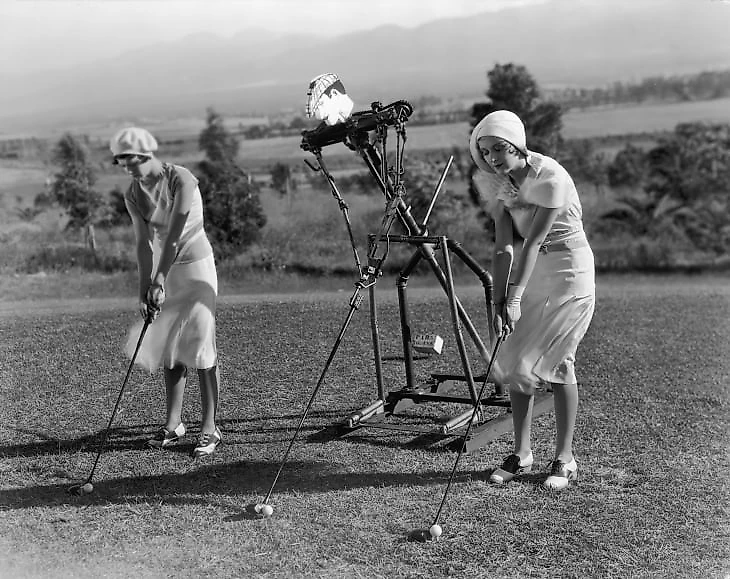 Гольфистки тренируются с механическим тренером, около 1925 года